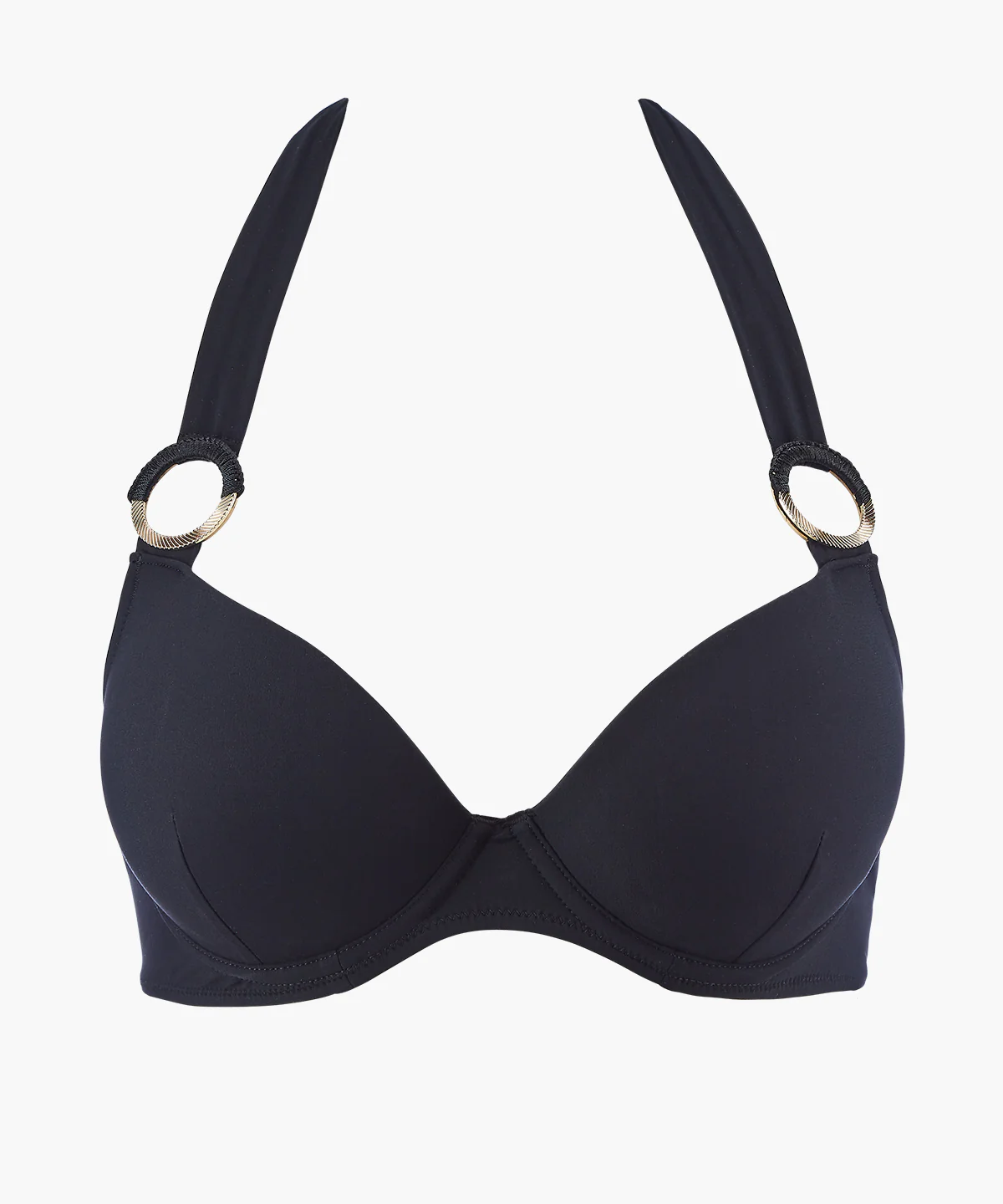Disponible jusqu’au bonnet E, le haut de maillot de bain plunge coque Secret Cove allie l’élégance absolue à un maintien optimal, garanti par sa matière stretch et ses coques intégrées, de couleur chair pour le modèle vert et ton sur ton pour le modèle noir. Offrant un effet push-up dégressif sur les plus grandes tailles pour un maximum de confort, sa forme plongeante agrandit visuellement le buste et rapproche la poitrine pour un décolleté sexy, encore davantage mis en valeur par les anneaux dorés avec cordage esprit macramé qui habillent la naissance des bretelles.