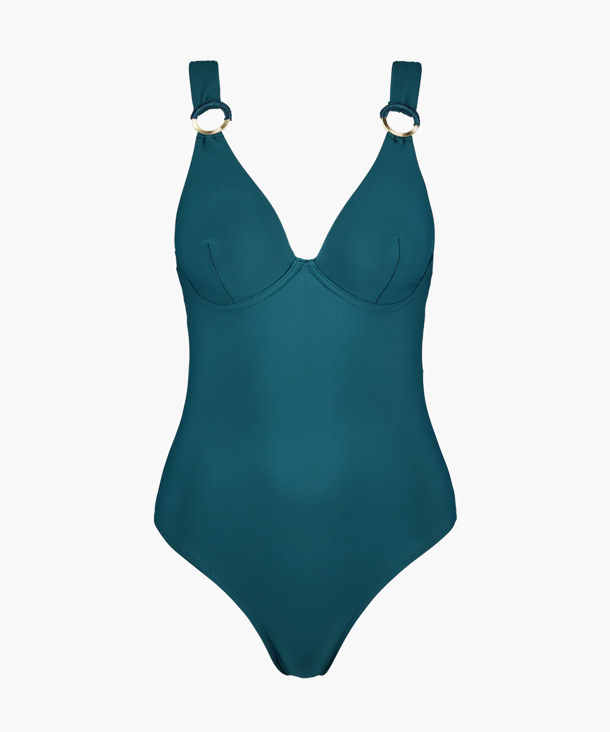 Offrant un excellent maintien jusqu’au bonnet E, le maillot de bain une pièce nageur armaturé Secret Cove déploie sur tout le buste une matière stretch recyclée et sensuelle, rehaussée à la naissance des bretelles par deux anneaux dorés habillés d’un cordage style macramé pour de subtiles évocations de bord de mer. Dans le dos, une ouverture sexy et élégante, illuminée par un fermoir doré, confère à ce modèle un esprit raffiné mais audacieux à porter comme un top avec une jupe légère ou un short taille haute pour un effet sortie de plage chic et glamour.