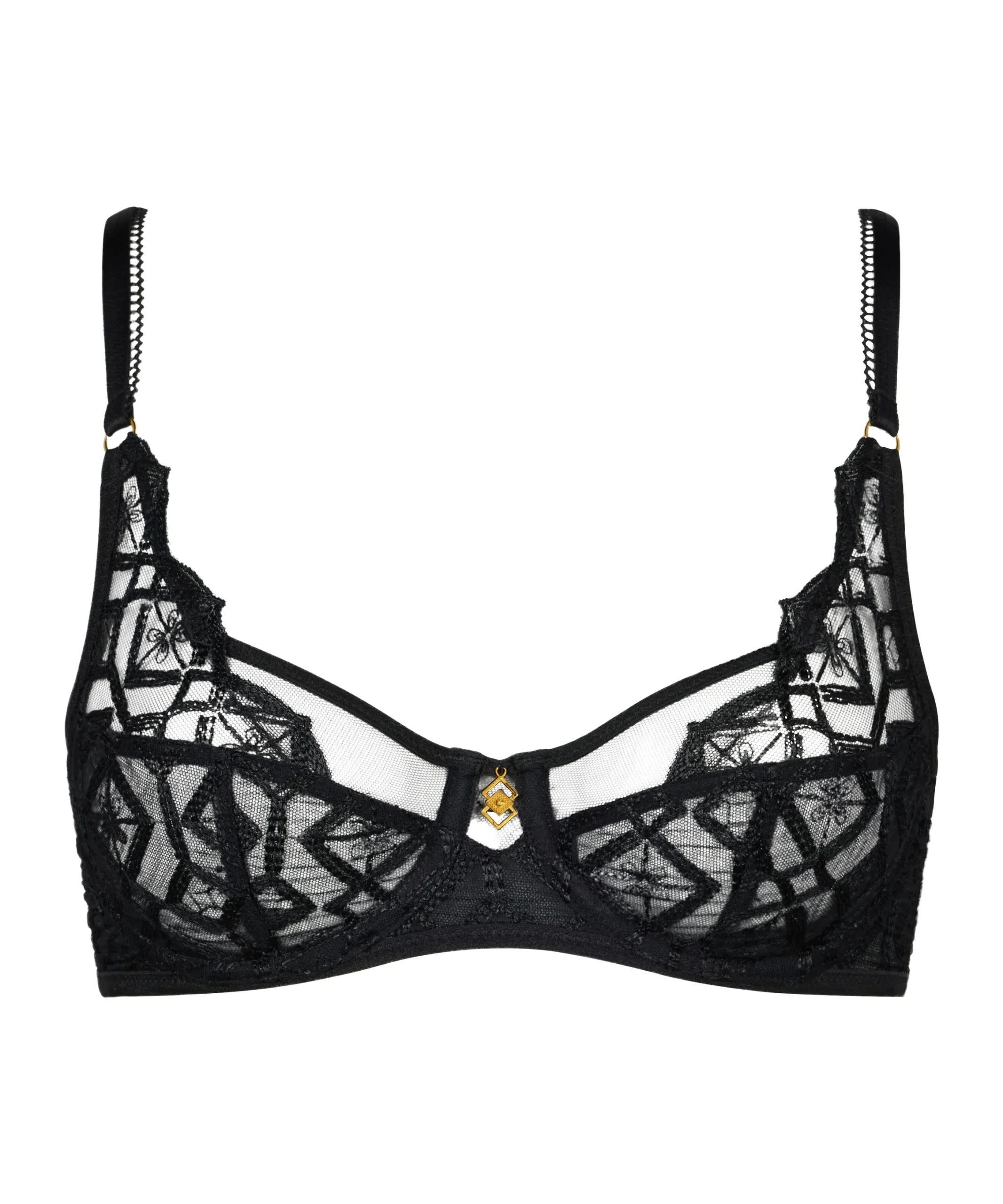 Jouant avec les contrastes entre un tulle doux qui met en valeur le galbe de la poitrine et une broderie graphique envoûtante, le soutien-gorge emboîtant foulard Sense of Illusion allie séduction et confort. Tout en transparence, il s’orne sur la naissance des bretelles et à l’entregorge de touches dorées lumineuses.