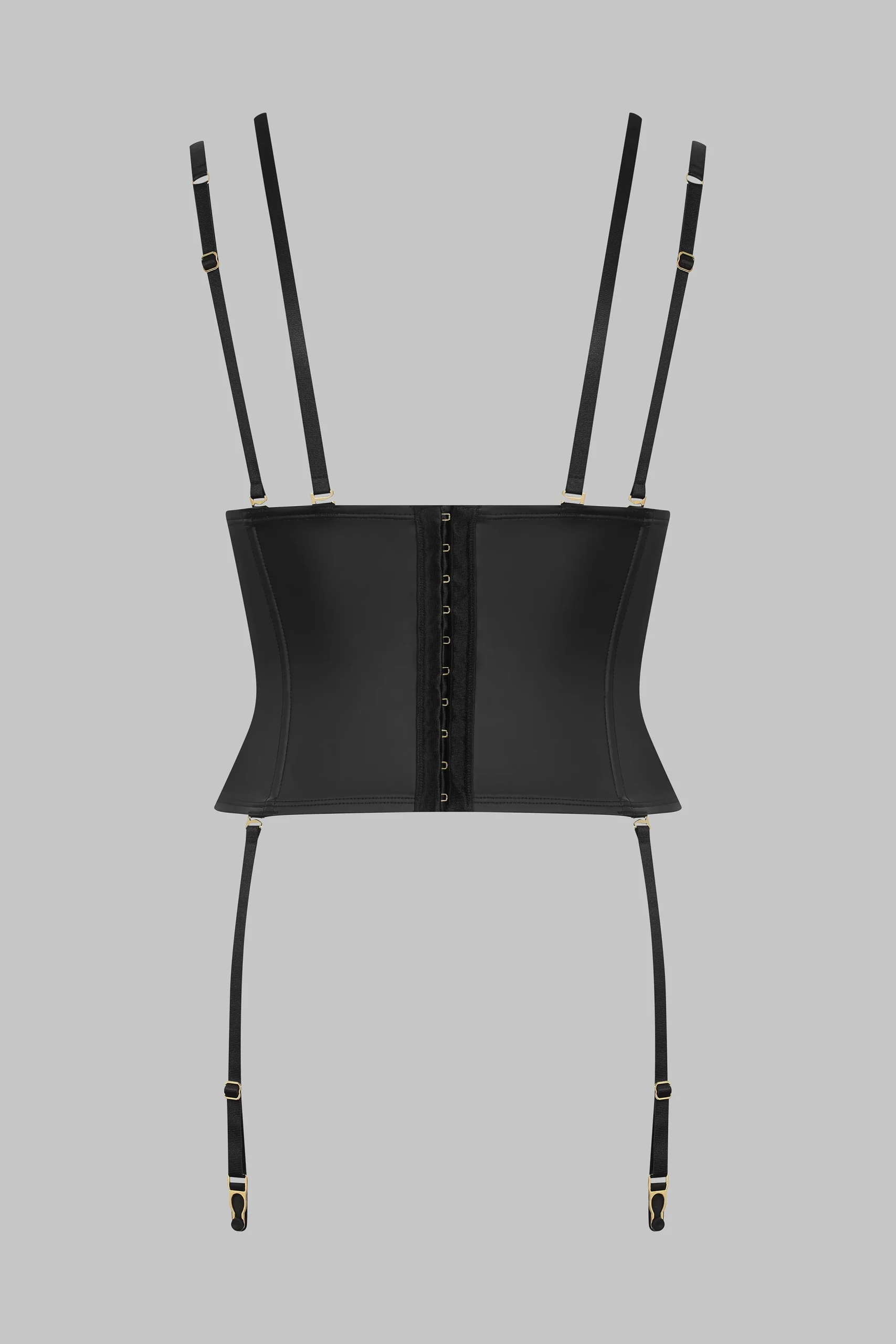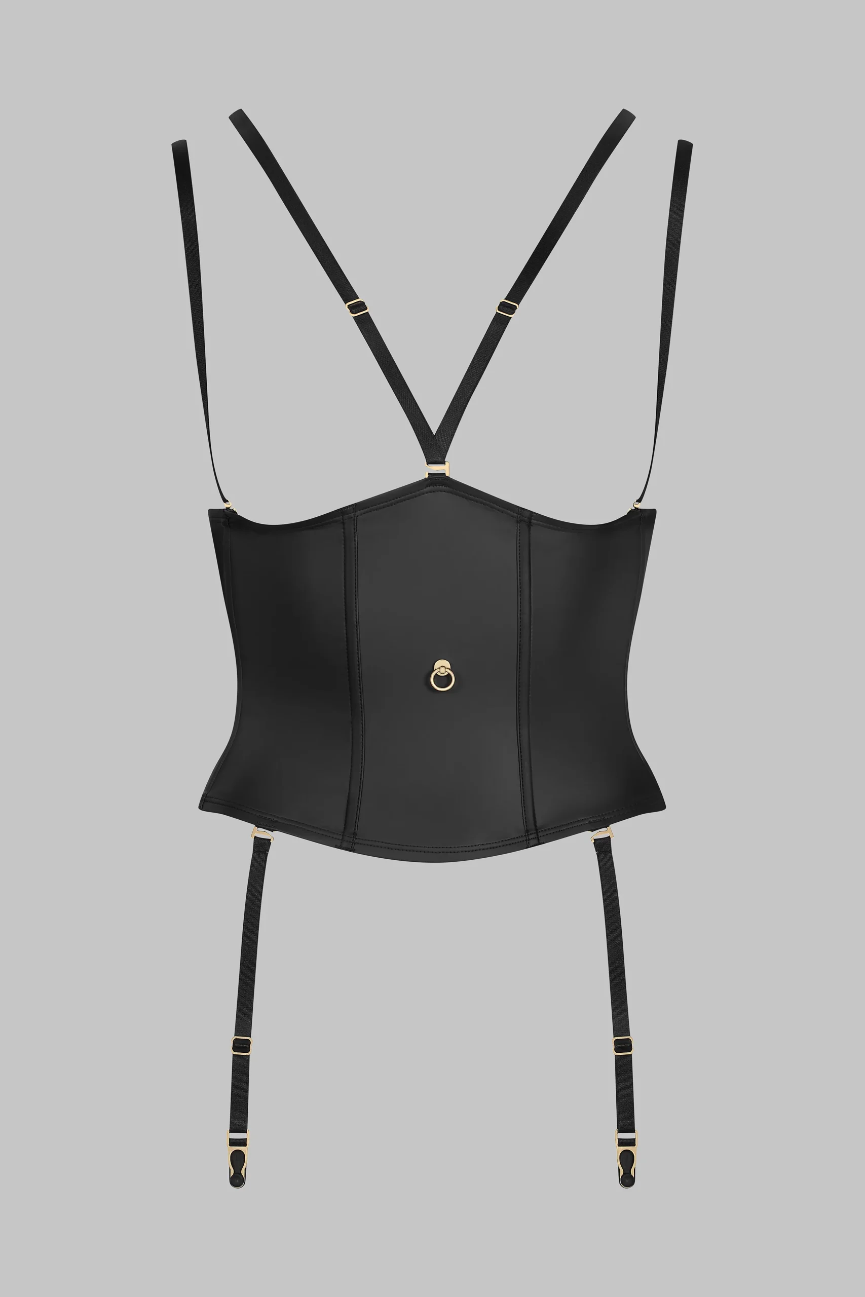 Serre-taille porte-jarretelles effet-cuir mat. Coupe ajustée qui souligne la taille. Jarretelles, bretelles et harnais tour de cou amovibles et réglables grâce à des accessoires dorés. Baleines souples verticales pour plus de structure et de maintien. Fermeture ajustable par un agrafage au dos. Signature de la collection, un anneau « féti-chic » doré orne le devant et suggère l’attachement.