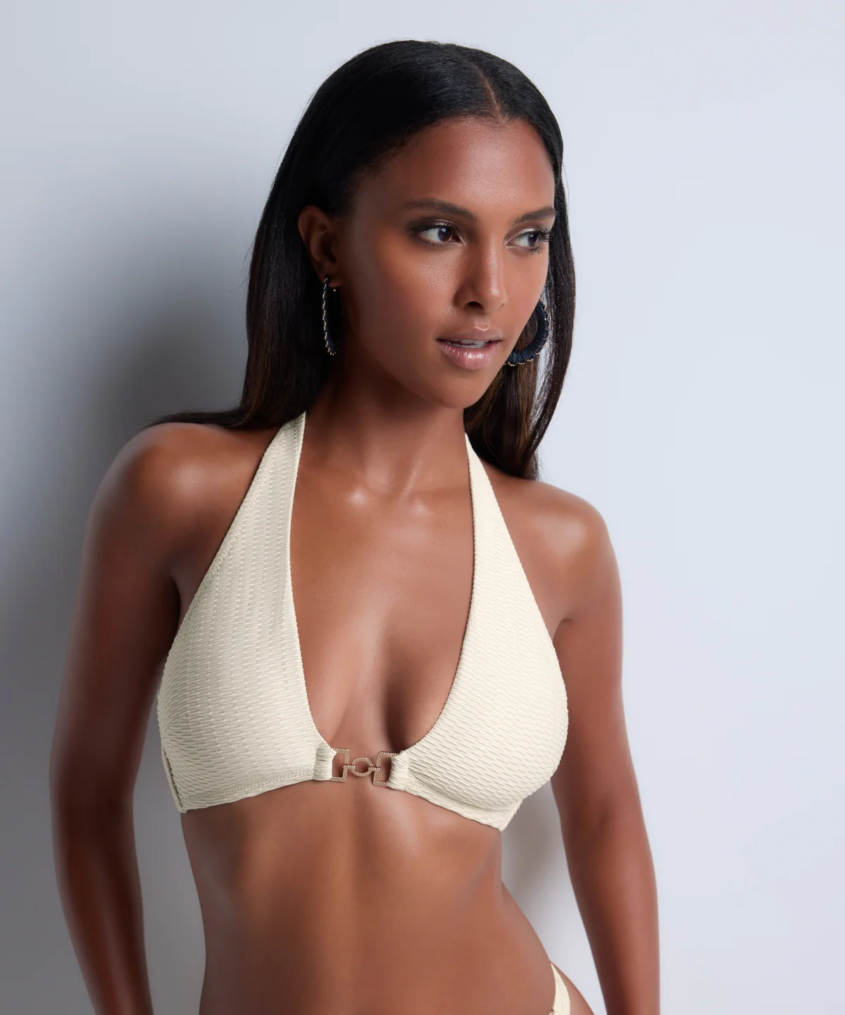 Sexy, le haut de maillot de bain triangle coque amovible Shimmering Waters habille le buste de sa matière étincelante, accentuant la profondeur de son décolleté, souligné, à l’entregorge, par un bijou doré. Derrière, les attaches à nouer à l’envi permettent à ce modèle exclusif de s’adapter à toutes les morphologies.