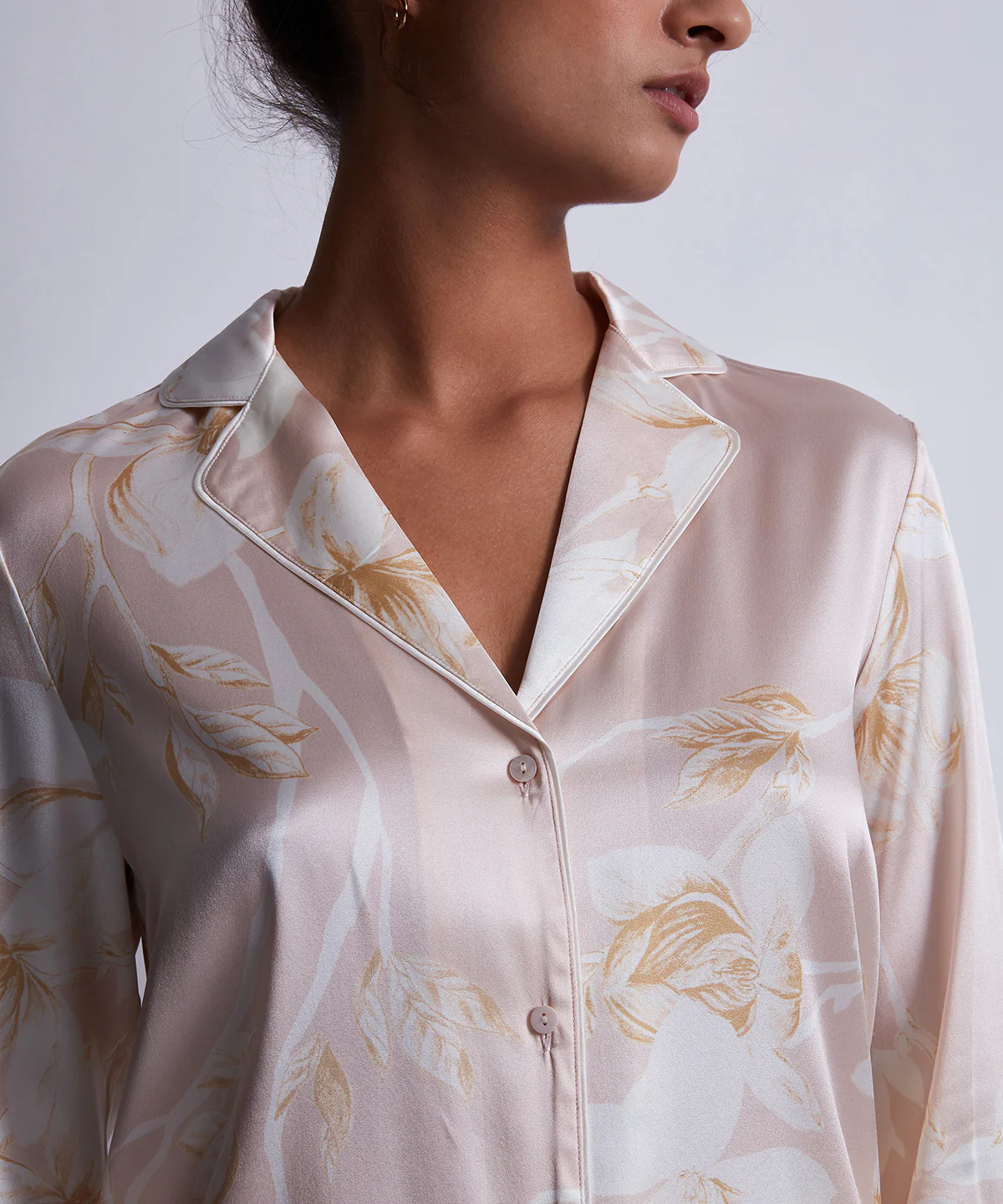 Mettant en valeur une soie précieuse dans une pièce sexy et moderne, inspirée du vestiaire masculin, le chemisier Silk by Night associe sa coupe élégante et ample à un coloris nude doux et sobre et à un motif floral romantique et bohême. Offrant devant un décolleté plongeant, souligné par un col large et un boutonnage discret, il se pare dans le dos de plis qui accentuent la fluidité de la matière et donnent une sensation de confort incomparable. Original, il se portera volontiers avec le pantalon de la même ligne pour un style total look décontracté très tendance ou avec un bas sobre à qui il portera une touche de sophistication tout en sensualité.