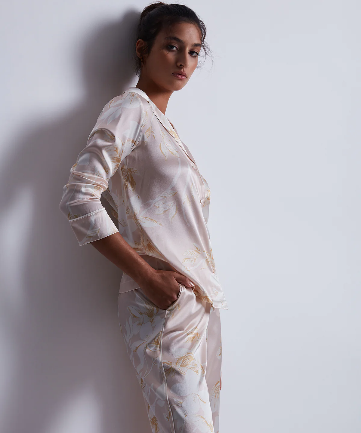 Confortable avec sa ceinture plate devant et élastique dans le dos, délicat et fluide, le pantalon Silk by Night déploie une soie douce et brillante, mise en valeur par un imprimé floral grand format romantique et élégant. Alliant la simplicité de sa forme avec la légèreté de ses matières et l’élégance de sa couleur, il peut s’associer avec le chemisier de la même collection pour un ensemble pyjama chic et moderne, inspiré du vestiaire masculin, ou être porté en journée ou en soirée, avec un haut blanc et des accessoires dorés pour un style bohême sophistiqué.