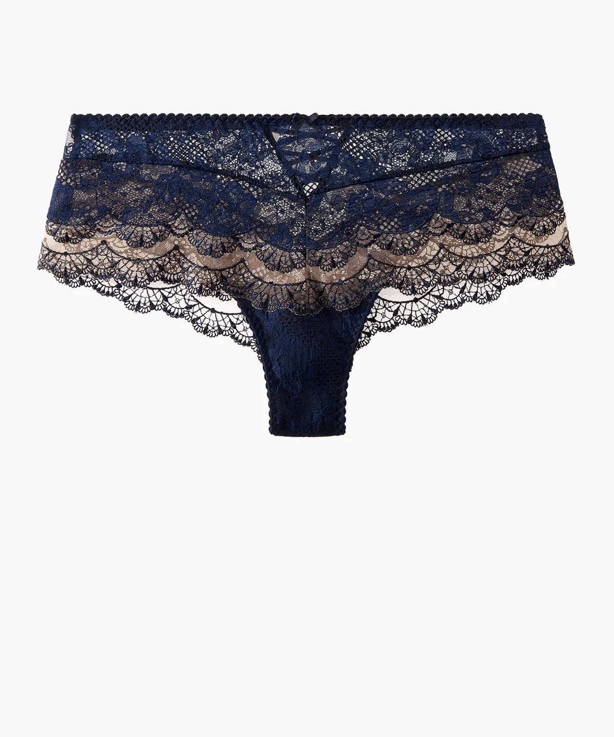 Pièce de lingerie iconique, le shorty Soleil Nocturne provoque le désir avec sa dentelle somptueuse et son laçage en satin au dos. Son coloris Crépuscule est une ode à la nuit avec son bleu nocturne sublimé par un tulle couleur chair délicat.