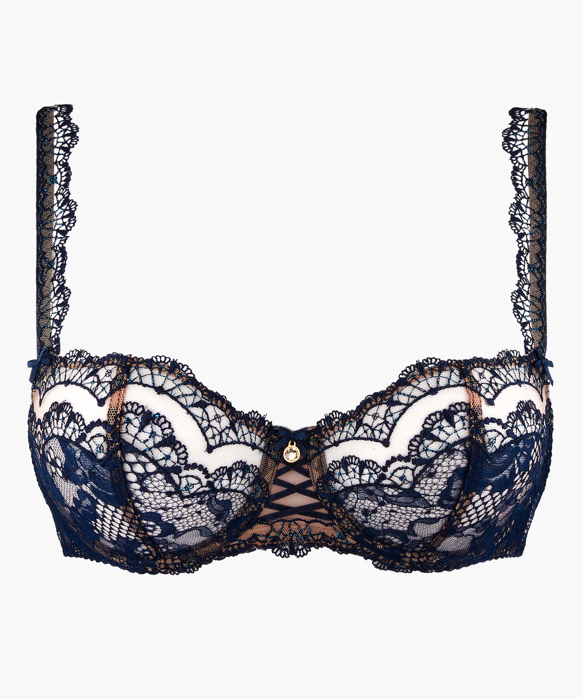 Lacé tel un corset et surmonté d’un petit noeud en satin, le soutien-gorge Corbeille Soleil Nocturne magnifie le buste féminin. Revisité en coloris Crépuscule bleu nuit et tulle chair, il orne tel un trésor un bijou cristal Swaroski à l’entre-sein.