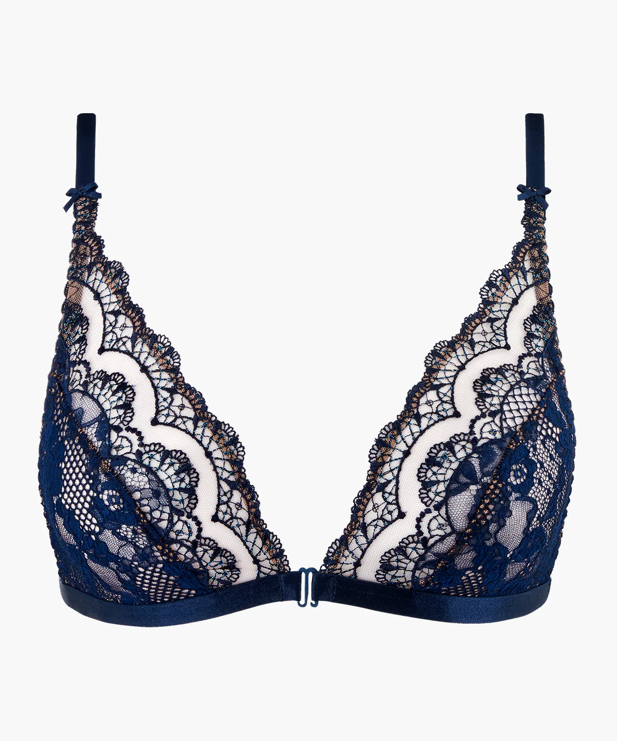 Avec son élégante pièce de dentelle au dos, le soutien-gorge Triangle Soleil Nocturne sans armature sublime la cambrure féminine. Fin et délicat, le soutien-gorge épouse le buste avec ses dentelles raffinées au ton bleu nuit, rehaussé d’un élégant tulle couleur chair.