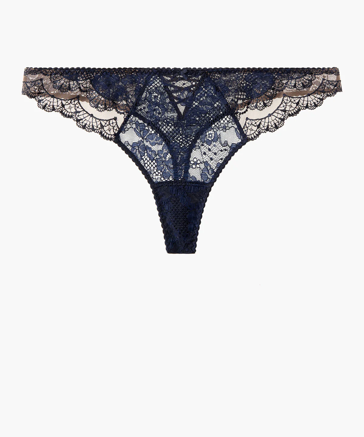 Le Tanga Soleil Nocturne enflammera les nuits avec son élégante coupe échancrée et son délicat laçage en satin au dos. En broderie suisse bleu nuit réhaussé d’un tulle chair raffiné, il sublime les courbes en toute discrétion.