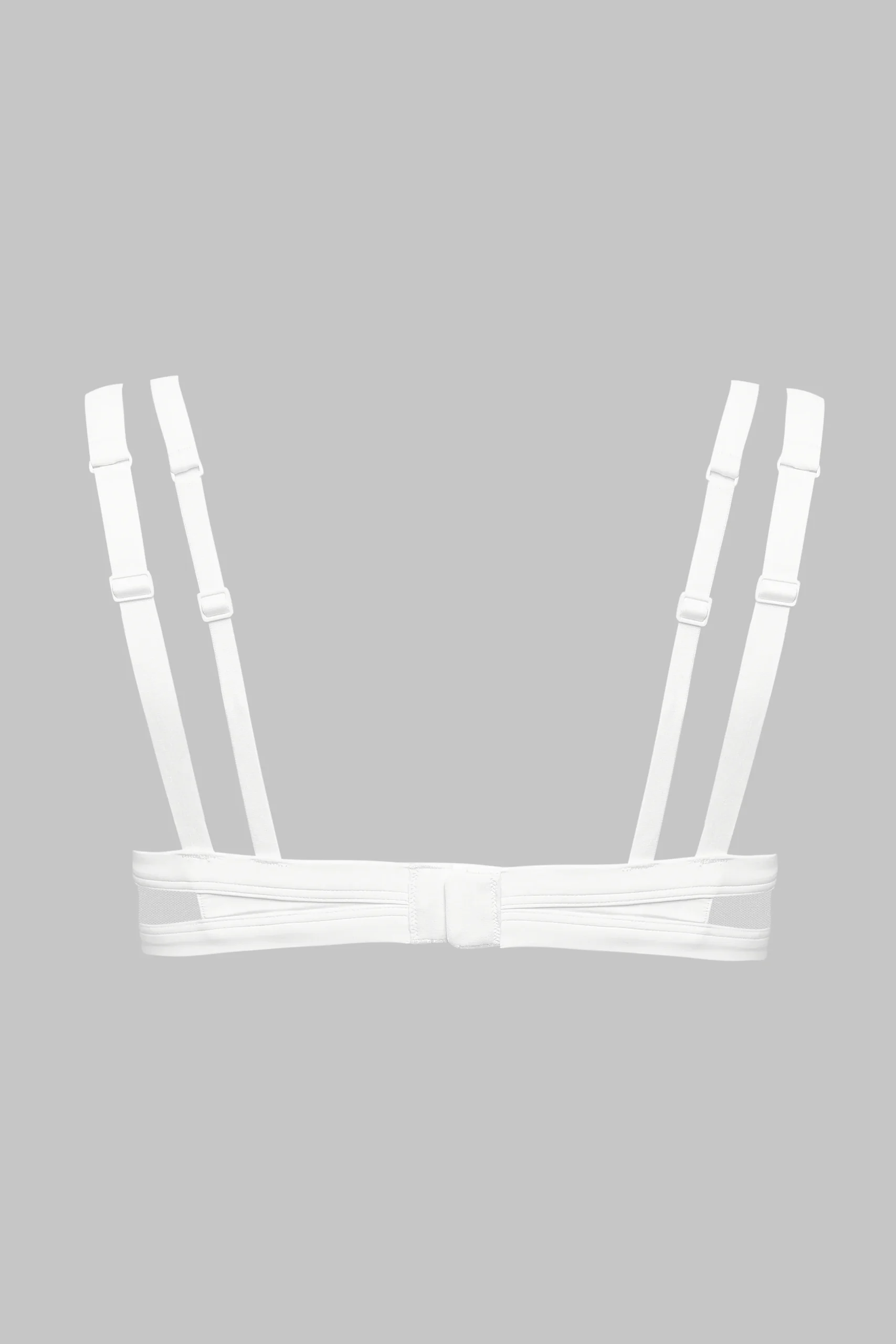 Sa construction bi-matière mêle tulle transparent et microfibre opaque, dans un dialogue subtil entre opacité et légèreté. Les armatures assurent un maintien précis, tandis que le harnais ajustable, intégré à la pièce, souligne la ligne du décolleté avec une intention assumée. Fermeture ajustable par un agrafage au dos.