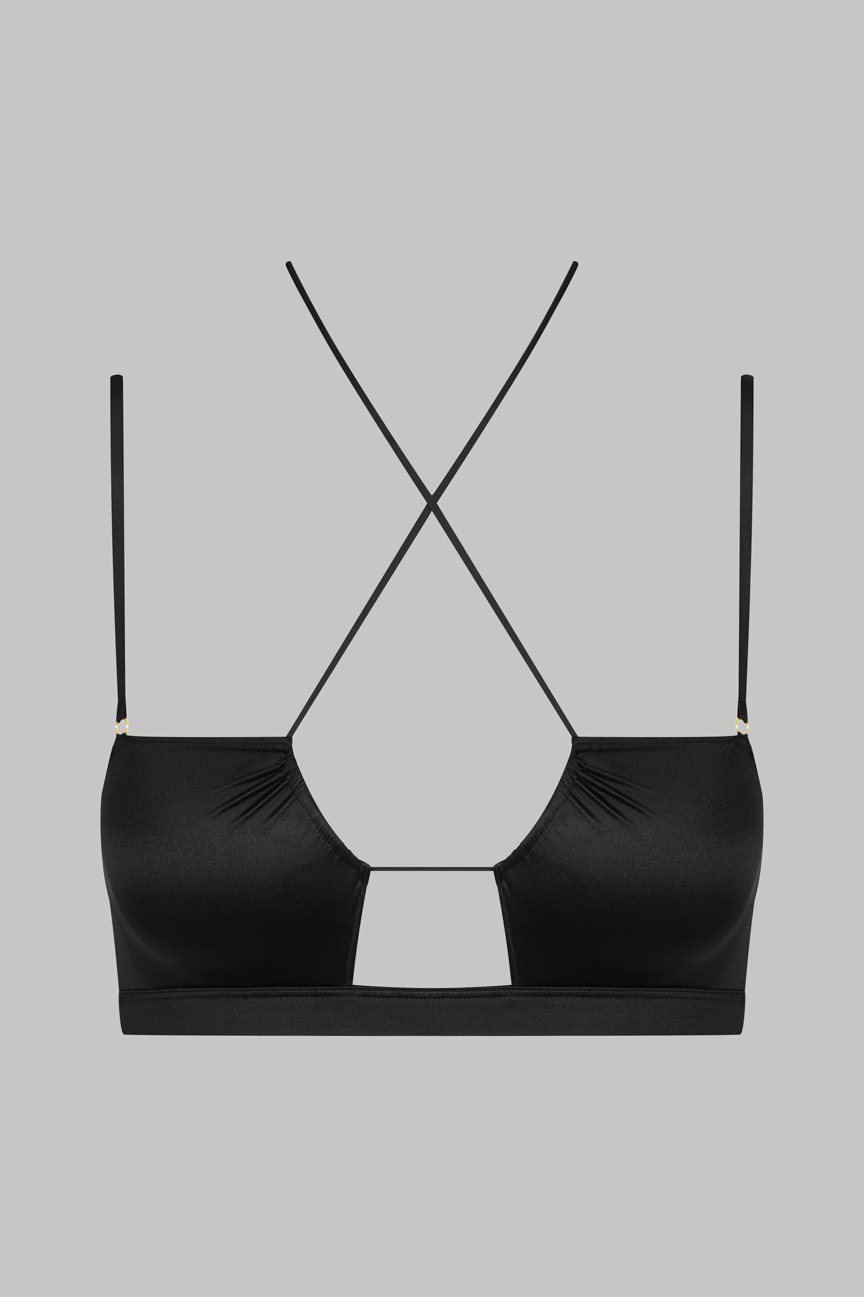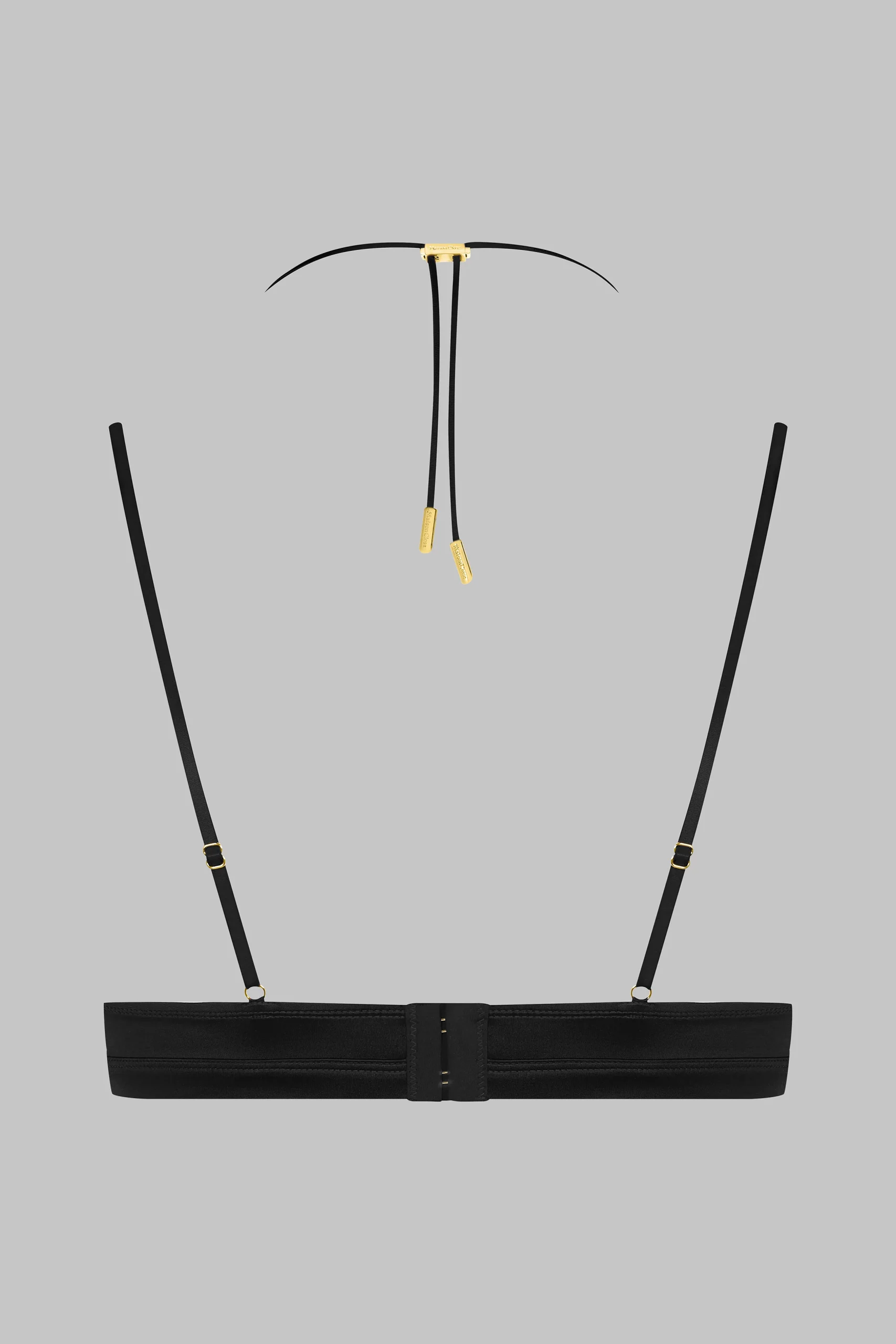Soutien-gorge brassière sans armatures, alliant douceur satinée et style. Les bonnets moulés sans couture sont élégamment structurés par un plissé au décolleté. Le laçage tour de cou, repositionnable et ajustable grâce à un régleur unique et des accessoires lipstick dorés signés Maison Close, sublime votre décolleté tout en permettant une personnalisation selon vos envies. Les fines bretelles plates et ajustables assurent un ajustement parfait. Une bande élastique en tour de buste épouse et galbe parfaitement la poitrine. Fermeture par agrafage ajustable au dos.