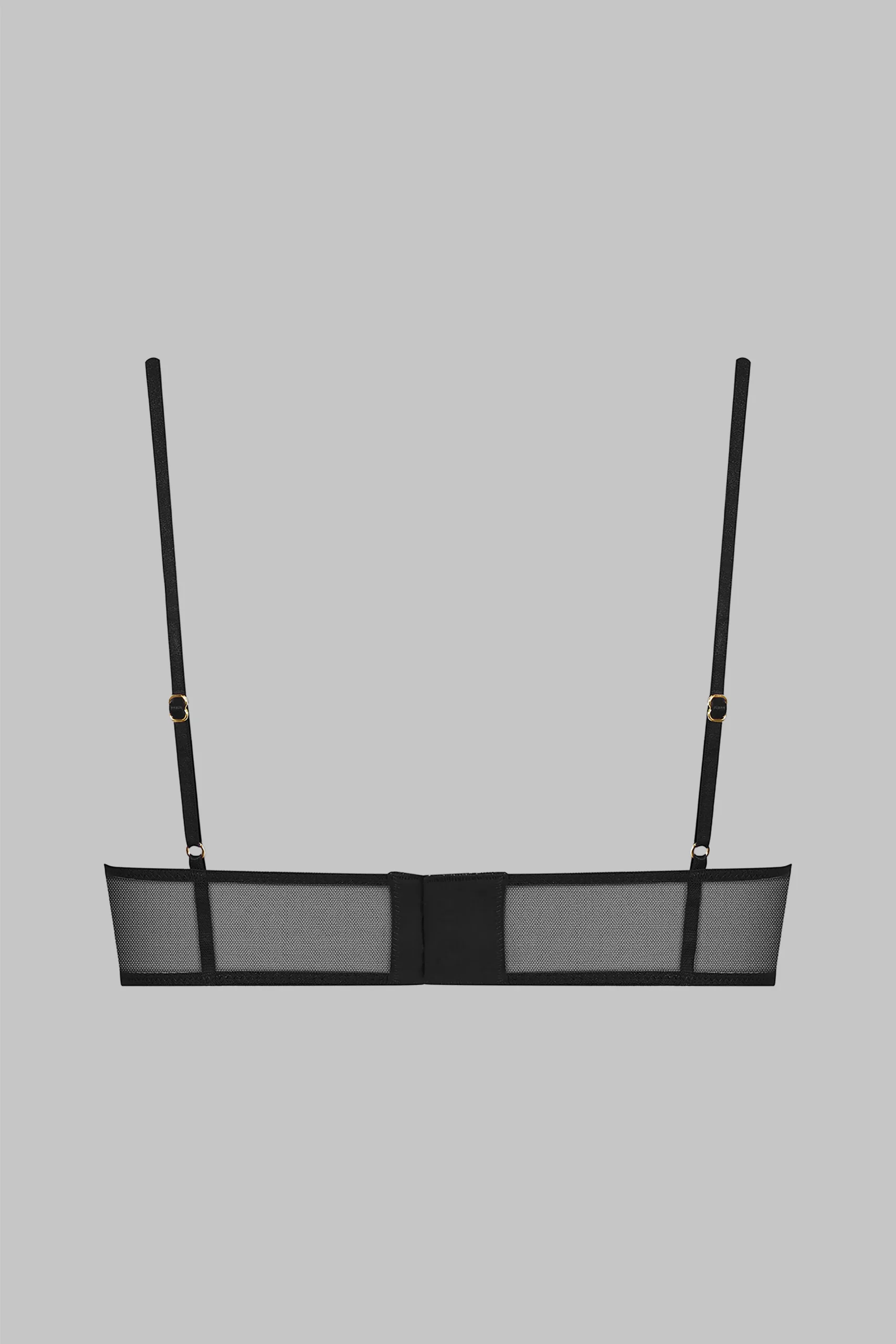 Le soutien-gorge brassière L’AMOUREUSE, en tulle d’une transparence absolue, se porte sans armatures. Des baleines souples sur le devant viennent structurer façon corset le décolleté. Les bretelles fines, réglables, et la fermeture au dos par un agrafage fin apportent un maintien léger et confortable.
