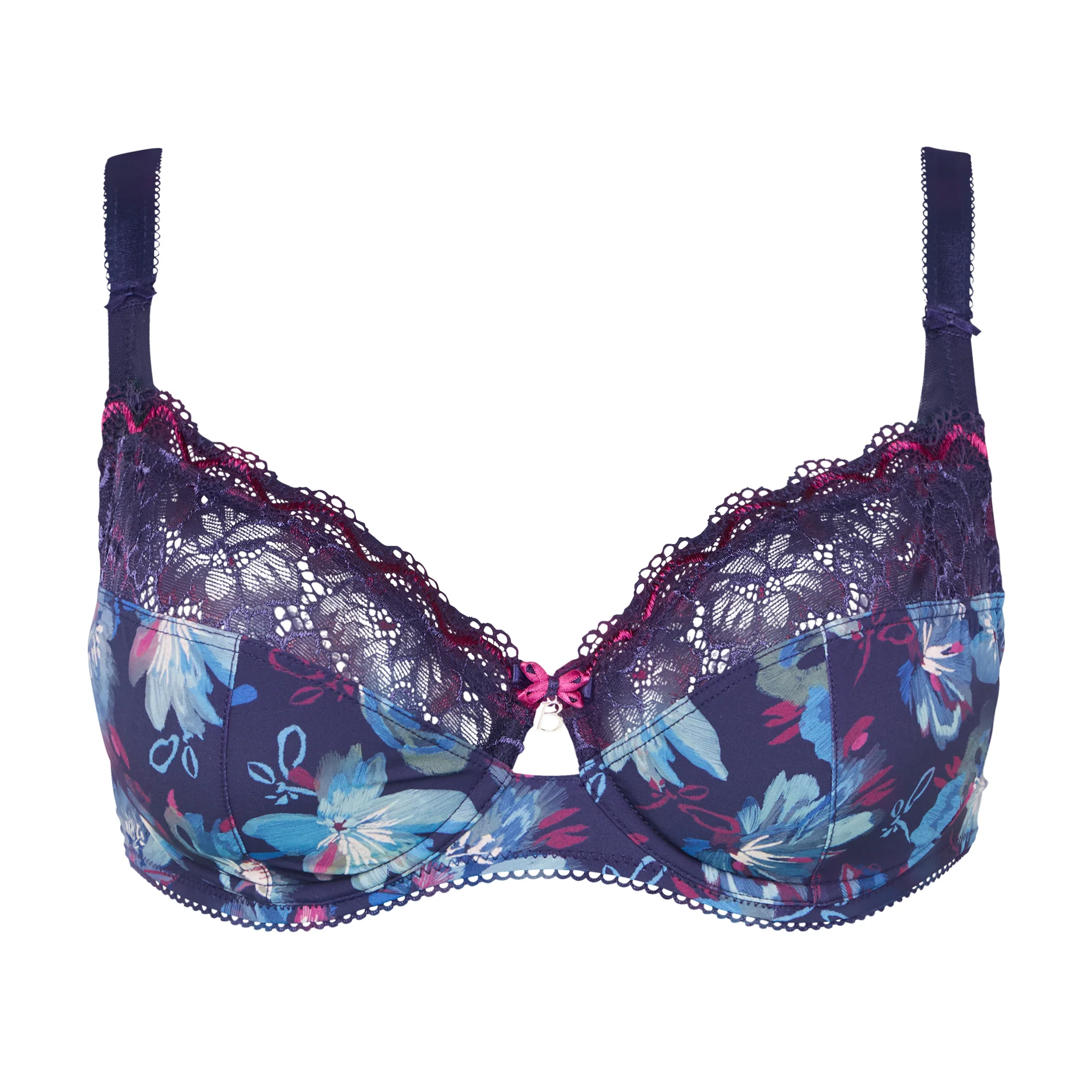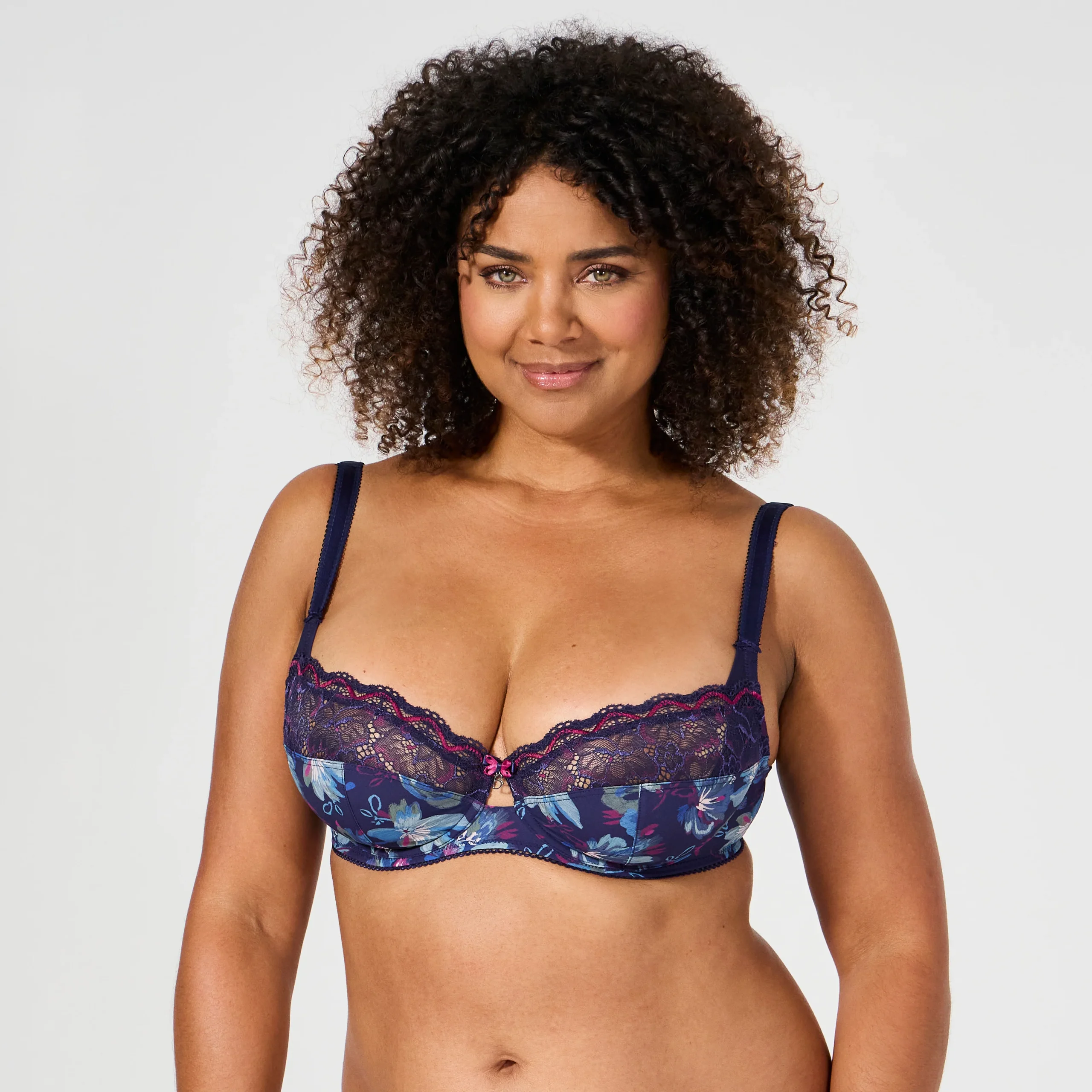 • Mélange entre une dentelle douce légèrement brillante en version bicolore et une maille microfibre avec un imprimé exclusif