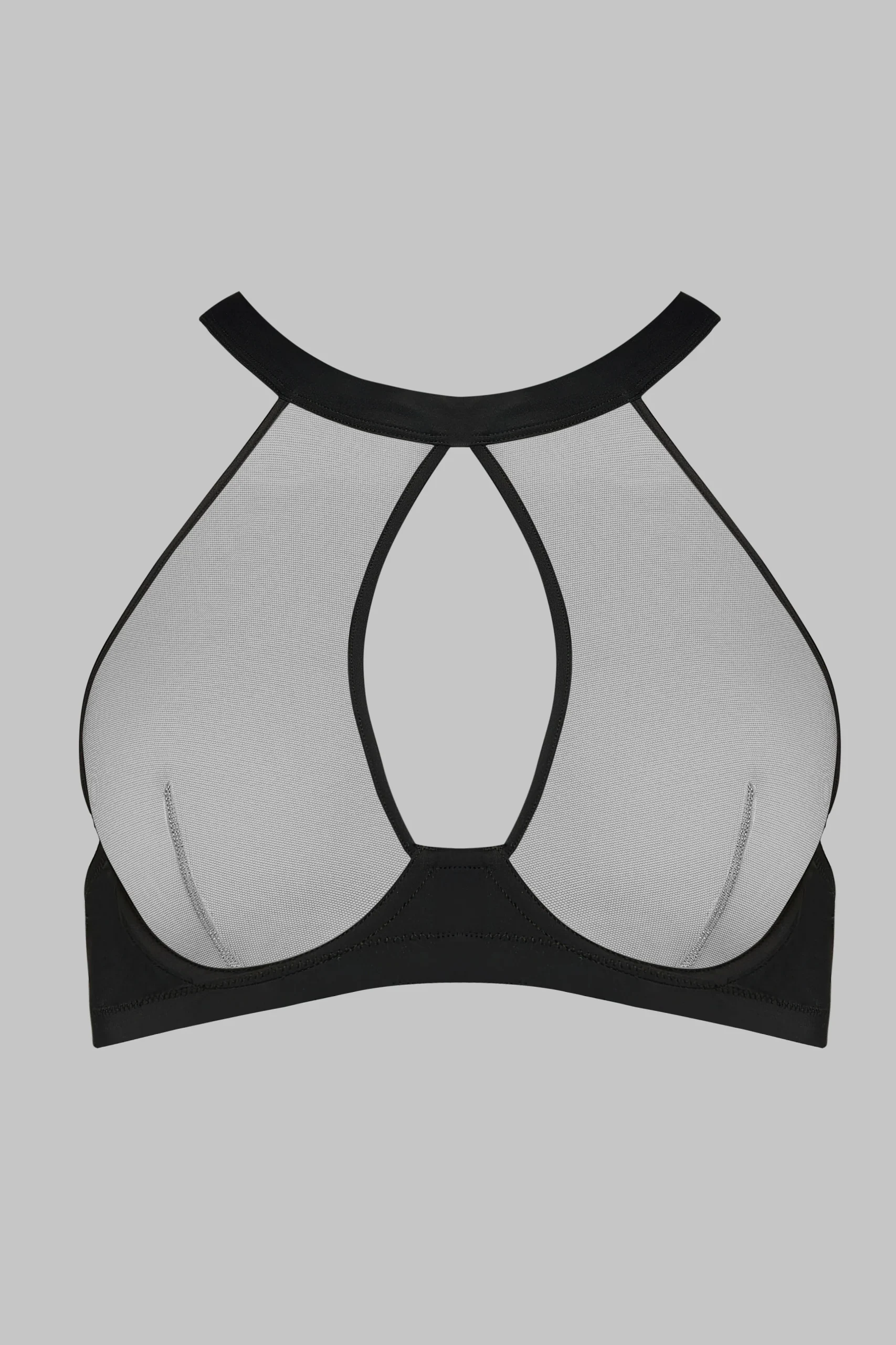 Le décolleté plongeant en forme de goutte laisse entrevoir la peau, souligné d’un tulle bordé qui dessine la ligne avec précision. Avec ses armatures, sans mousse ni doublure, il offre un maintien naturel et une allure libre, sans artifice. Il se ferme dans le dos par un agrafage discret et s’ajuste grâce à des bretelles réglables.