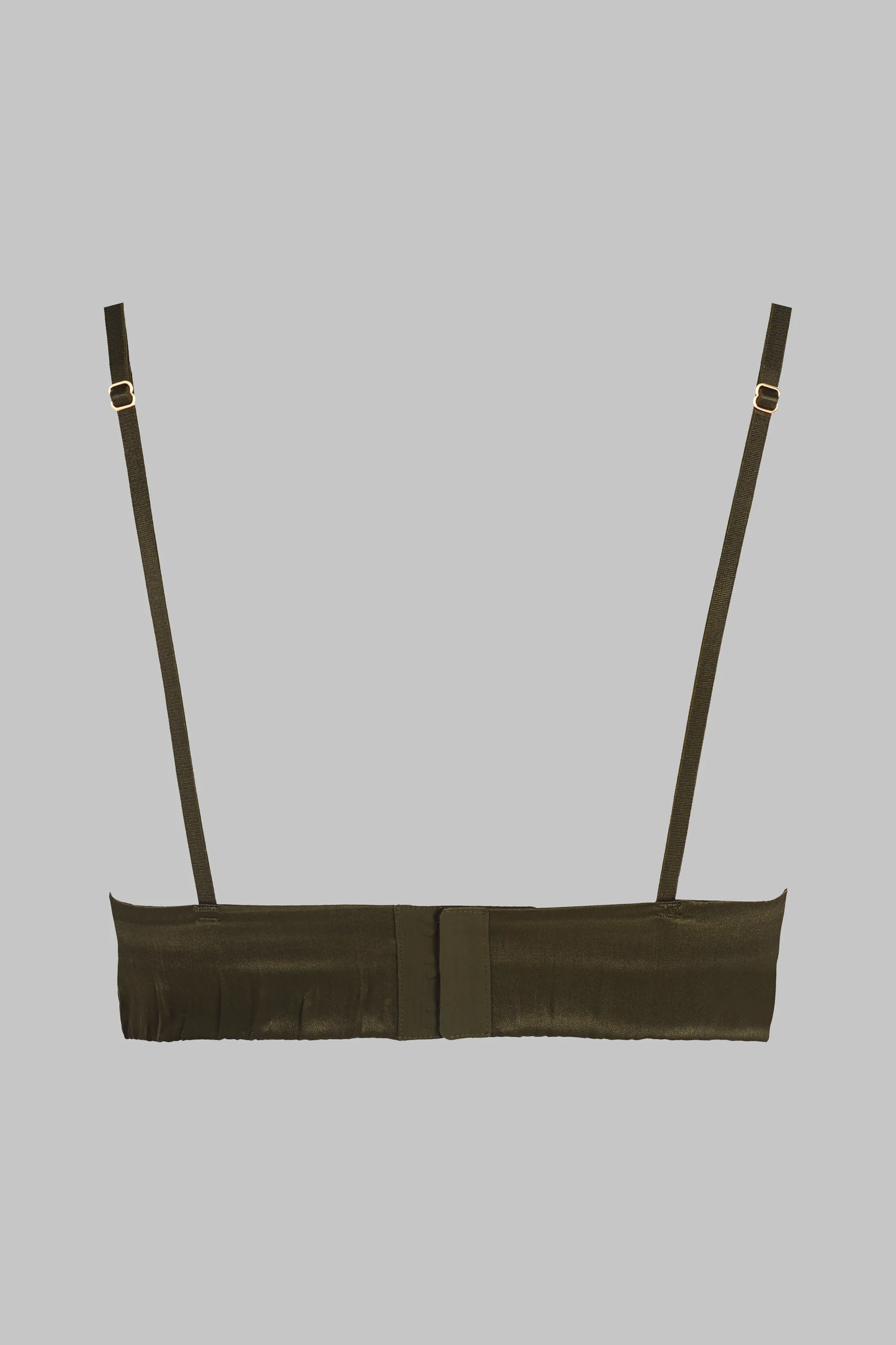 Soutien-gorge triangle bustier en soie et dentelles à cils. Bonnets triangle sans armatures en dentelle rigide transparente qui épousent parfaitement les seins. Un large bandeau recouvert de soie froncée et élastique au dos apporte un maintien parfait. Fermeture au dos par un agrafage ajustable. Délicates bretelles réglables aux accessoires dorés.