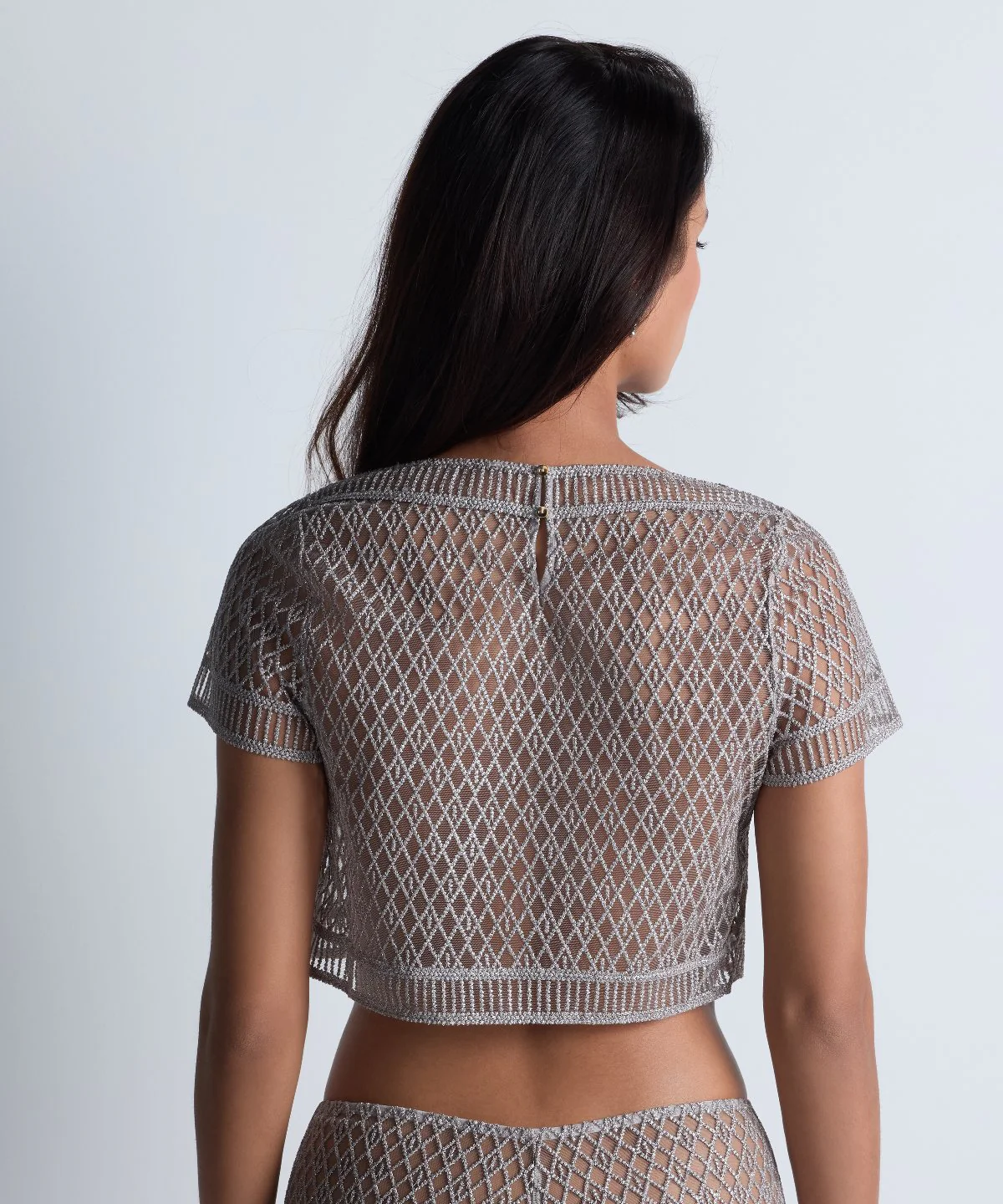 Brouillant les frontières entre ce qui se cache et ce qui se montre, le top manches courtes Stardust Dream déploie sa broderie scintillante dans un modèle moderne et sexy à la coupe courte et ample. Entièrement transparent, il joue la carte de la fausse innocence pour une silhouette résolument audacieuse.