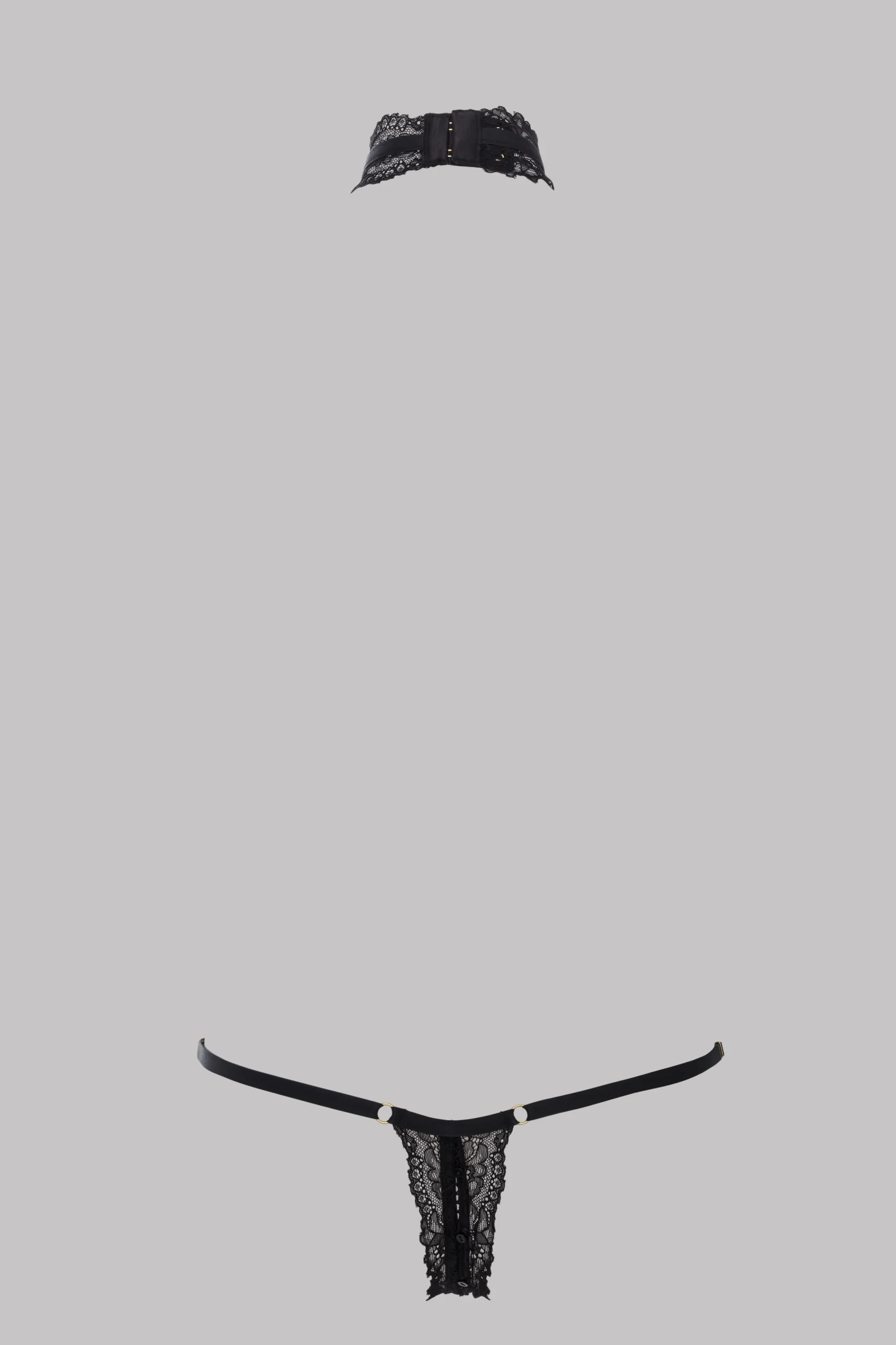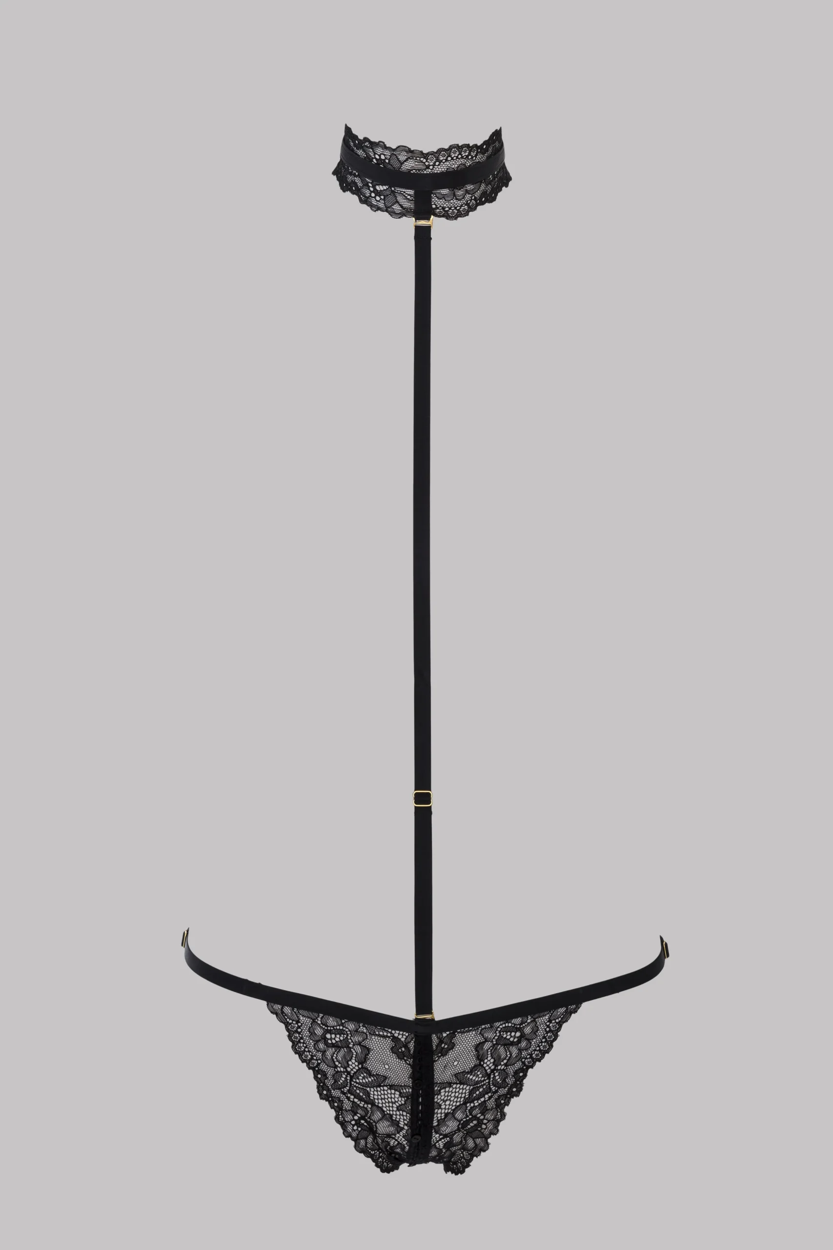 String harnais en dentelle florale et élastiques extensibles et ajustables sur les côtés. Ouvrable à l’entrejambe par des boutons tons sur tons.