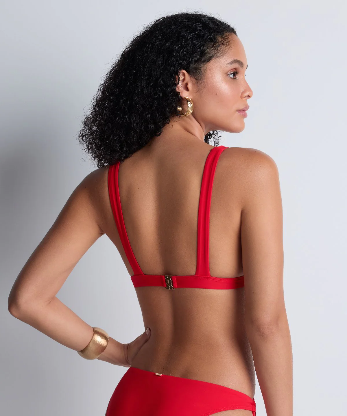 Déployant sa matière recyclée confortable jusque sur l’épaule, le haut de maillot de bain triangle Summer Essence crée un décolleté vertigineux, souligné à l’entregorge par un anneau graphique et sexy. Dans le dos, les bretelles larges confèrent à l’ensemble un effet sculptural et structuré pour une silhouette tout en sophistication.
