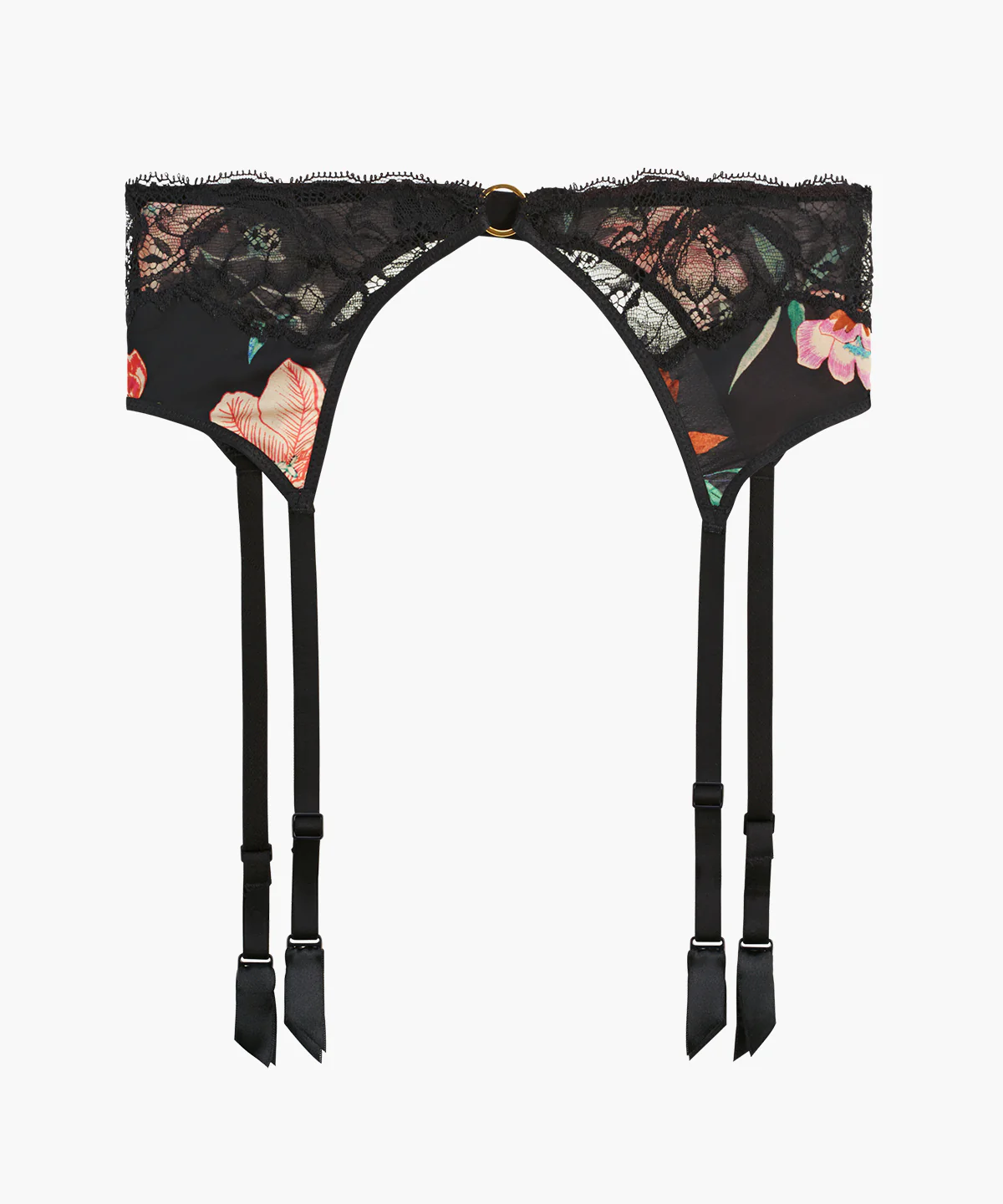 Habillant avec raffinement les hanches et redéfinissant dans un imprimé bohême chic les codes de la séduction qu’évoque cette pièce iconique de l’univers de la lingerie sexy, le porte-jarretelles Sweet Folk est disponible en Poétique, dans un coloris noir élégant aux reflets lumineux, afin de mieux mettre en valeur l’imprimé floral dont l’esprit bohême et épris de liberté souffle sur toute la collection.