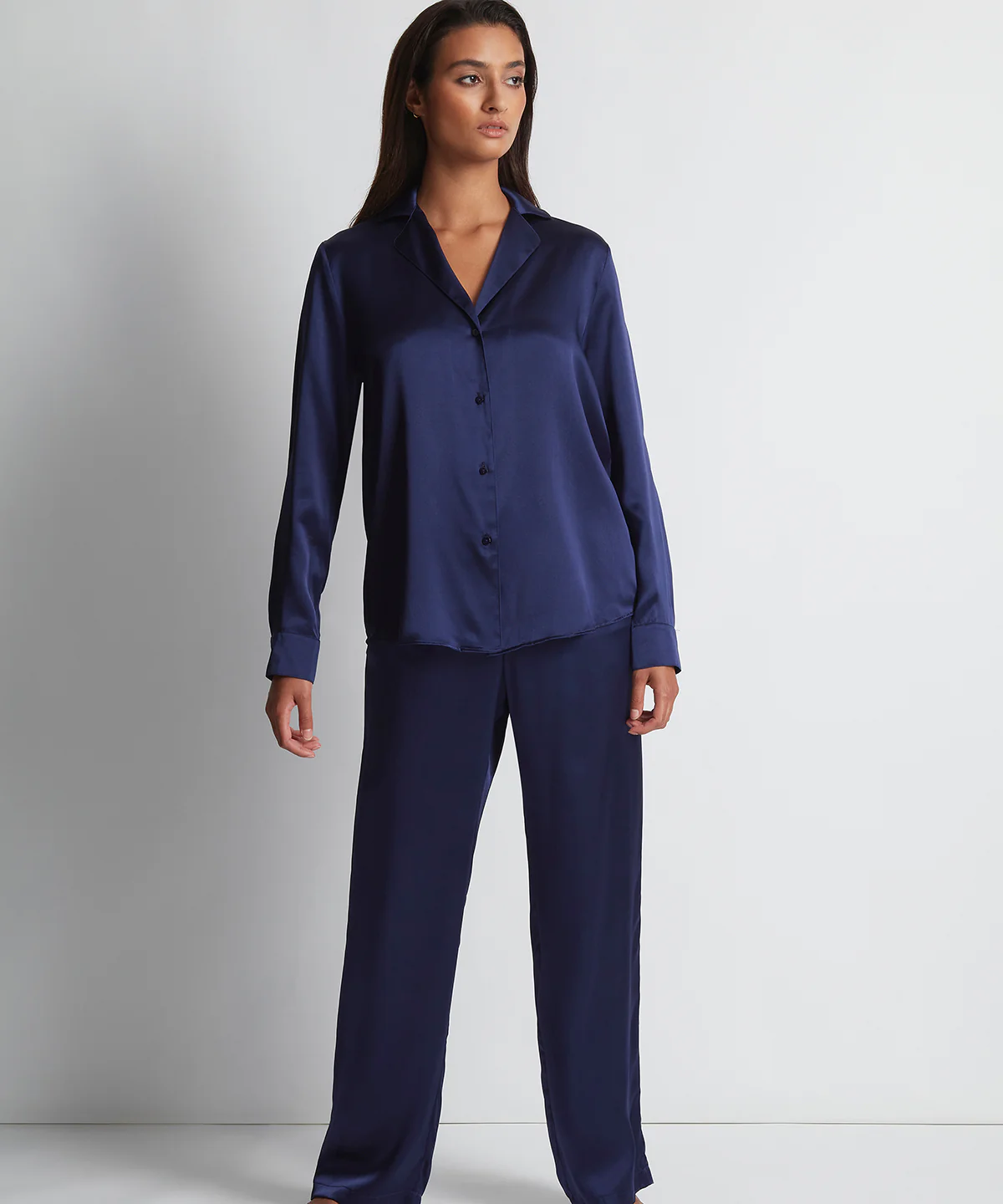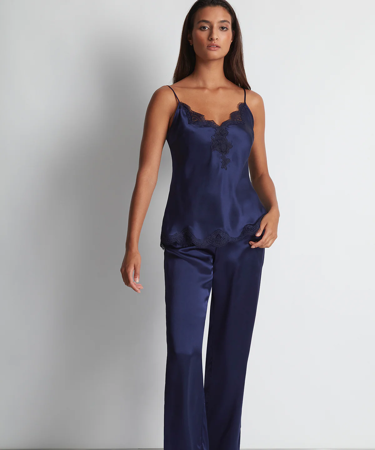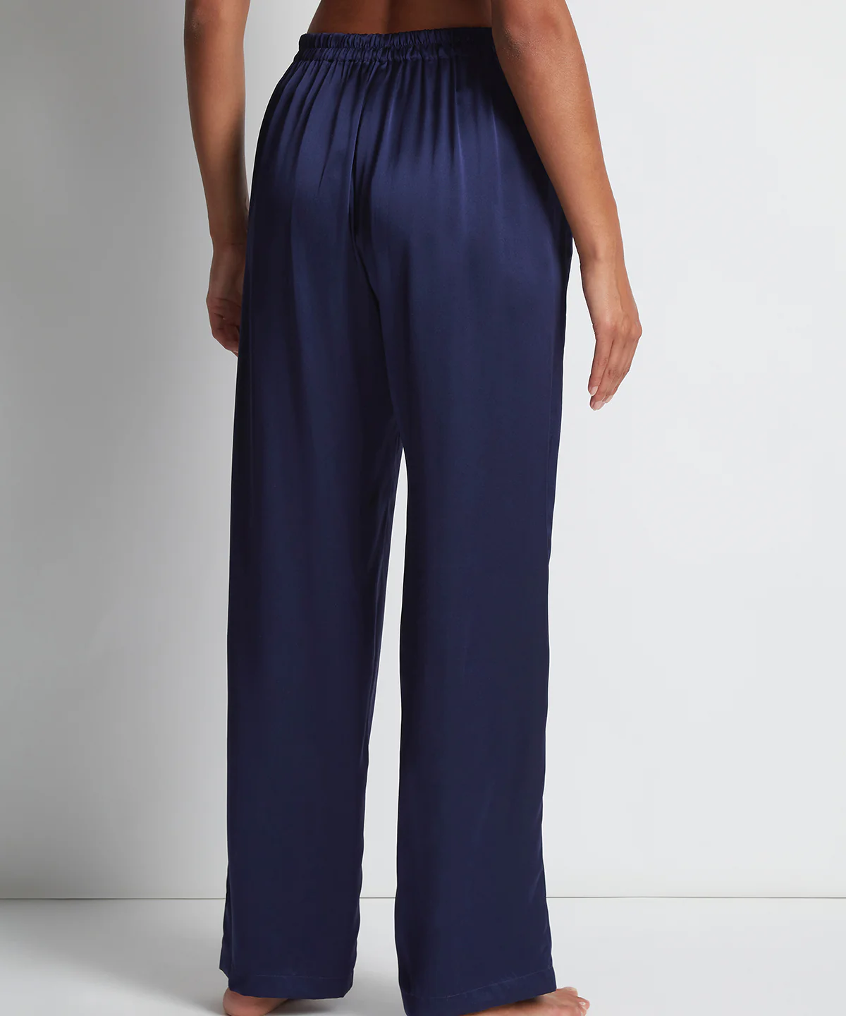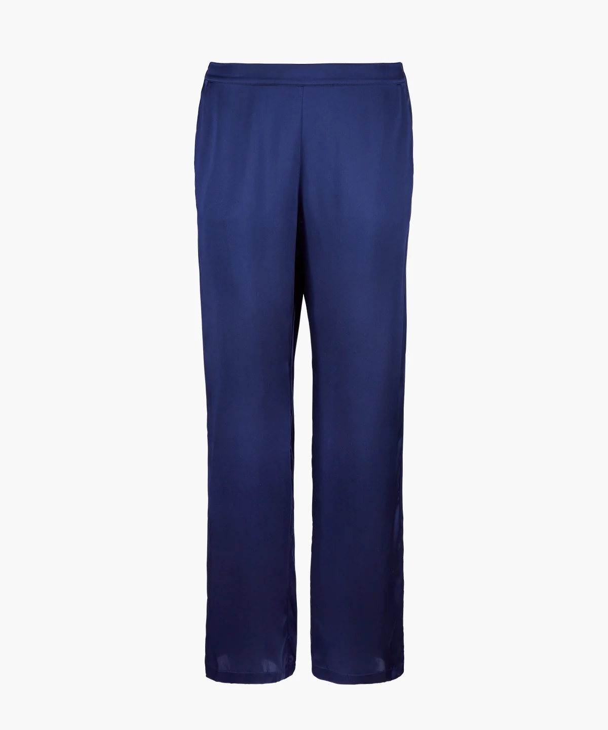 Ample et léger, le pantalon Toi Mon Amour est un indispensable des moments de détente à la maison. Pensé pour être porté comme vêtement d’intérieur, associé à un haut de la même collection pour un raffinement absolu ou dépareillé pour un effet de style décalé, il est entièrement en soie délicate, douce et sexy dans un coloris bleu nuit élégant et offre une ceinture plate devant assurant un confort optimal sans compression sur le ventre et froncée dans le dos pour un maintien garanti.