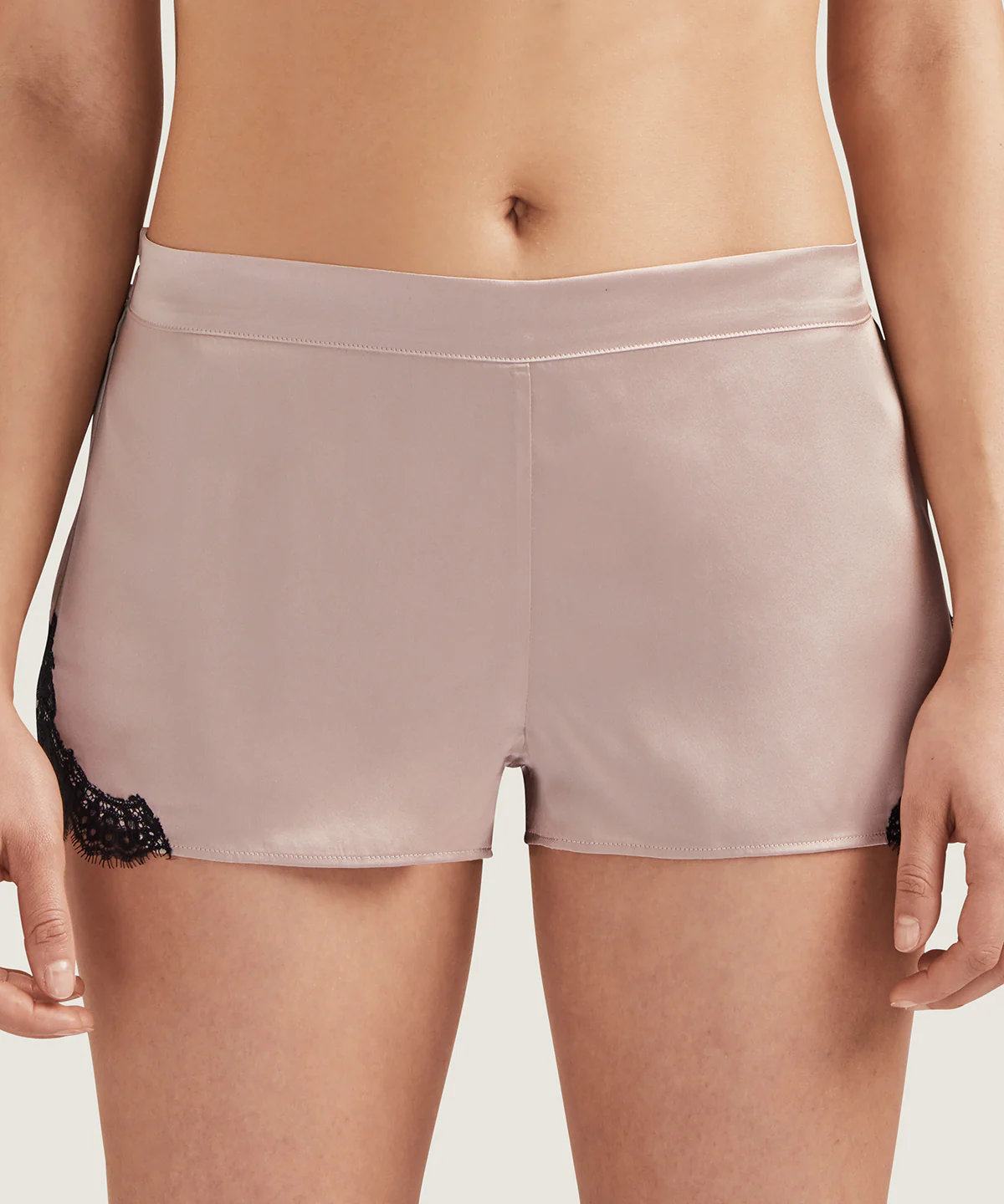 Moderne et confortable, le shorty se porte avec aisance. Sa soie offre un porté glamour et se pare d’une teinte vieux rose qui se confond avec la peau. Les hanches sont sublimées par une dentelle noire délicate et sexy.