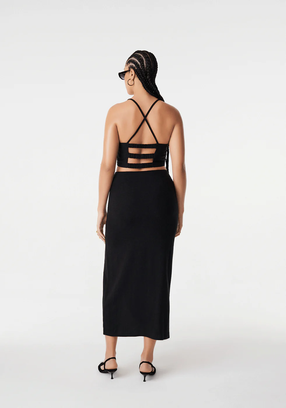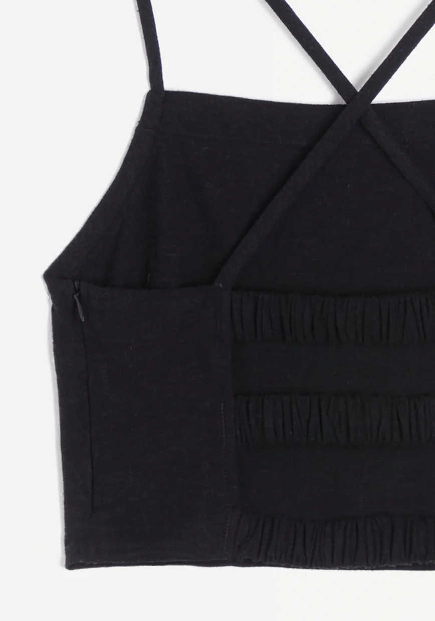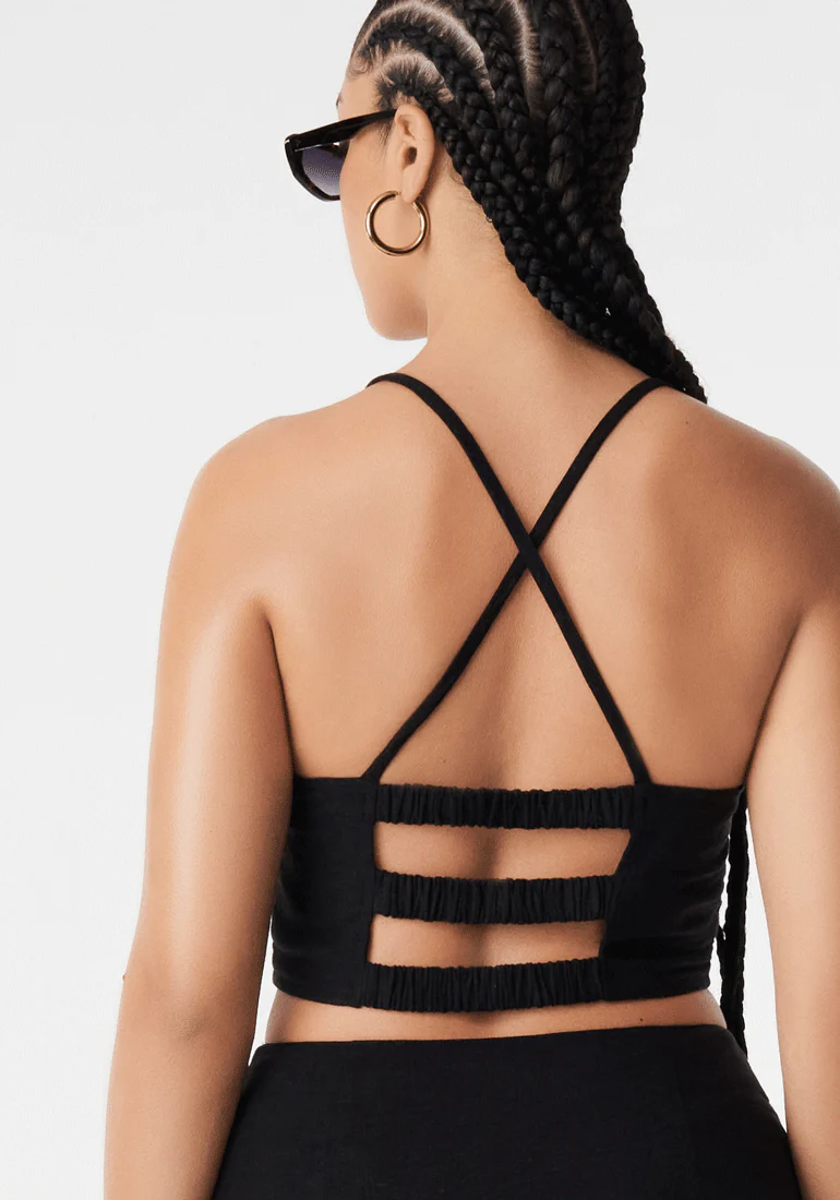 Ce top en lin mélangé présente une encolure haute et une coupe ajustée. Des bretelles croisées et trois bandes élastiques habillent le dos.