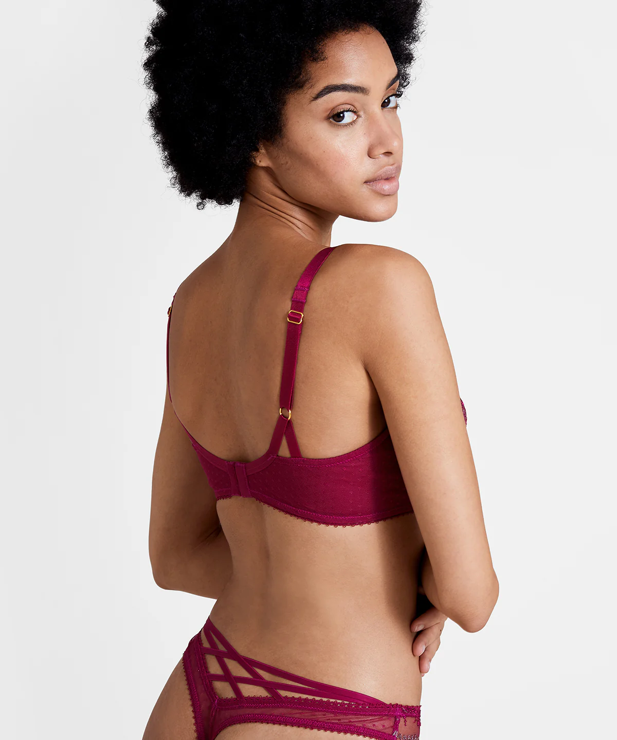 Le Soutien-gorge corbeille avec armatures de la ligne Trésor Infini décline sa sensualité jusqu’au bonnet G. L’entregorge se dévoile sous un laçage très sexy qui rappelle les bretelles sur le devant et l’arrière. Ce modèle offre un confort parfait et un décolleté pigeonnant galbé par des bonnets aux coutures verticales.