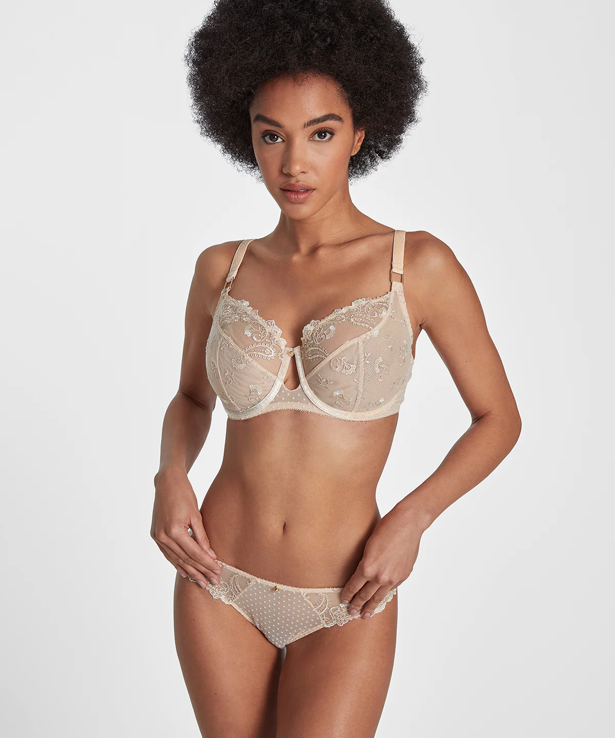 Disponible jusqu’au bonnet H, le soutien-gorge emboîtant Velvet Memories ne sacrifie rien à l’élégance avec des matières nobles comme la broderie française sur la poitrine, le tulle de l’agraphe, le velours des bretelles extensibles et les anneaux rectangulaires martelés en zamac doré, tout en assurant maintien et confort.