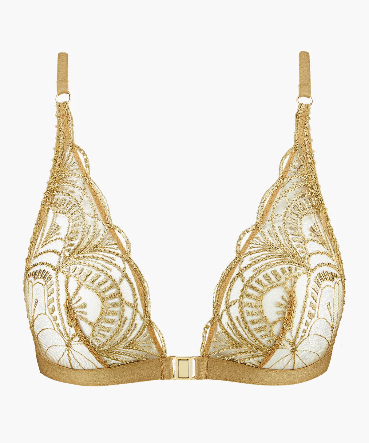 Sans armatures, le soutien-gorge triangle bralette Vibes offre une coupe moderne et confortable jusqu’en XL. Déployant sa broderie graphique, il confère au décolleté une profondeur très sensuelle, soulignée par une boucle dorée. Derrière, il se pare d’un jeu de liens qui dévoile le dos dans un esprit subtilement érotique.